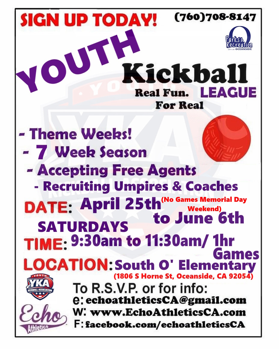 10 to 12 weeks of kickball games and more and more people to meet great games, and events throughout the OCEANSIDE Area! There’s never been a better time to join Echo Athletics Kickball, See you on the field!